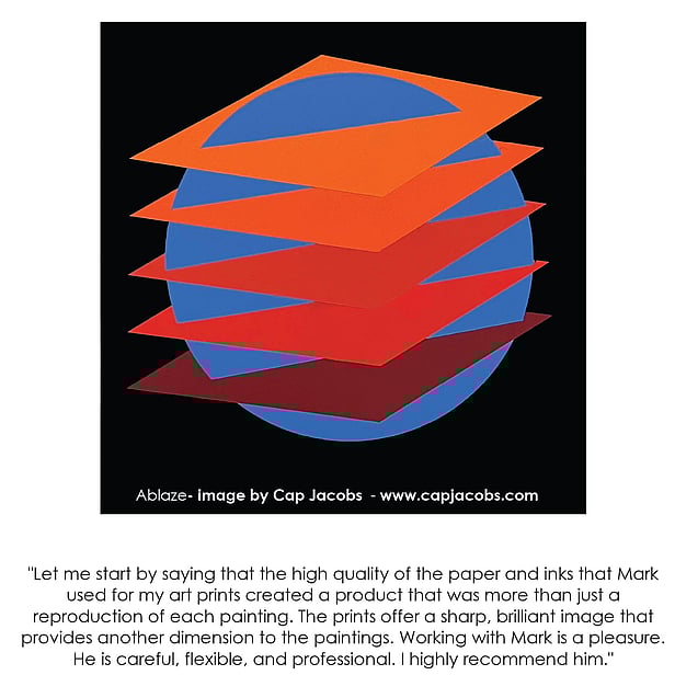 "Over the past few years I have been extremely satisfied with the prints of my paintings that Mark has done for me. He produces images that are of the highest quality with sharp definition and exact colour match. Mark has a personal manner that reflects his interest in working with clients to create the best results."
